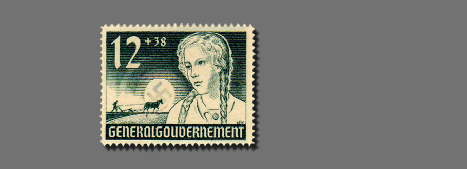 12Gr value from the set of stamps commemorating the First Anniversary of the General Government, the term used to describe German-occupied Poland. The design is based on a portrait made by the artist Otto Engelhardt-Kyffhauser of a young ethnic German immigrant, Marie Eppler, who was relocated from Galicia to repopulate the incorporated territories of Western Poland.