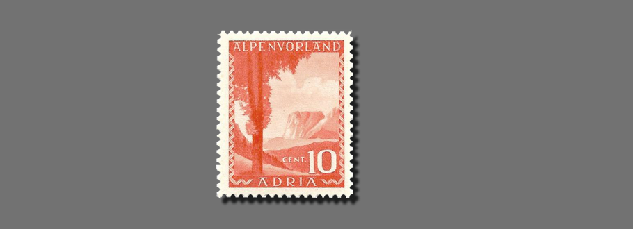 A fantasy 10ct Alpenvorland Adria stamp taken from a set of 16 that were produced after the war. The designs and framework were based on the ‘Province Laibach’ set of 16 views of Slovenia issued in March 1945.