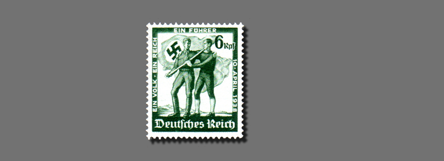 Postage stamp issued simultaneously in Austria and Germany to commemorate the 1938 Anschluss (union with Germany). It depicts German and Austrian citizens united below a Nazi banner. It was designed by Professor E. Puchinger whose initials appear at the foot of the Austrian printing.