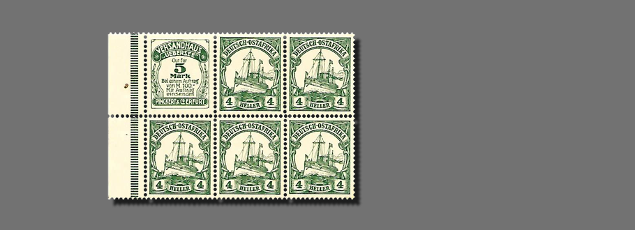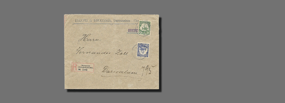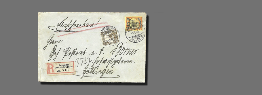 A registered letter sent from Daressalam on 3 April 1909 to Göttingen franked with the 2½ and 20 heller ‘yacht stamps’ with watermarks. The registration fee was 15 heller and the postage for a letter up to 20 grams in weight to Germany was 7½ heller.