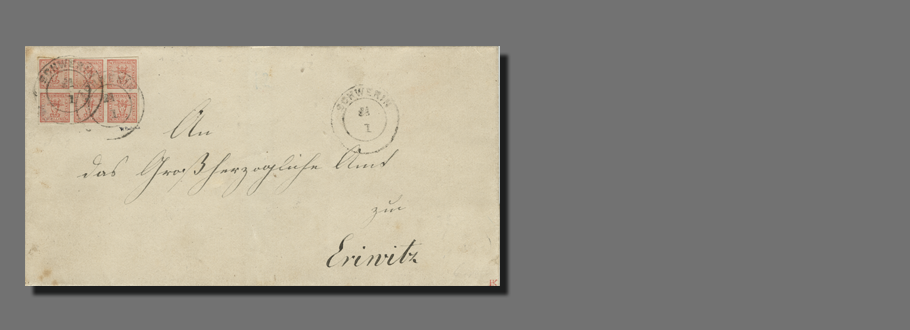 This letter has a block of six ¼ Schilling stamps to pay the required 1½ Schilling rate. The stamps were printed in sheets. Blocks of four stamps were separated by piercing (incorrectly described as rouletting), giving a separable stamp of 1 schilling. The four components of this stamp could then be separated by cutting to provide for various postal rates
