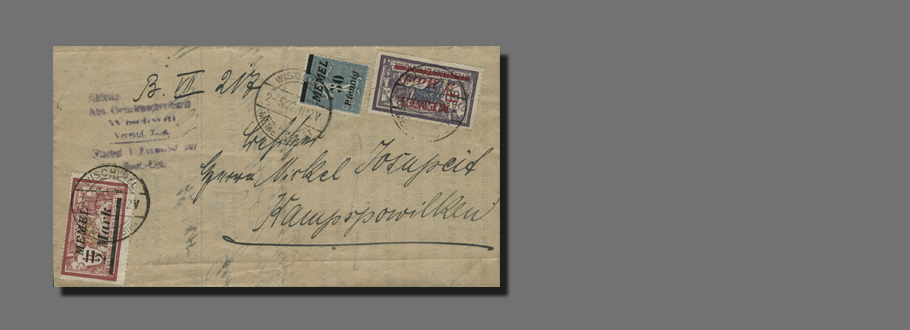 The first large-format Danzig coat-of-arms issue of 1 August 1921 not only added three higher values – 5, 10 & 20 – to complete the range of definitive stamps available, but thereby introduced a more elaborate design akin to the coat of arms seen on civic documents, seals and the like. The designer Max Buchholz incorporated his monogram, MB, into the bottom centre of the stamp below the ‘N’ of ‘DANZIG’.
