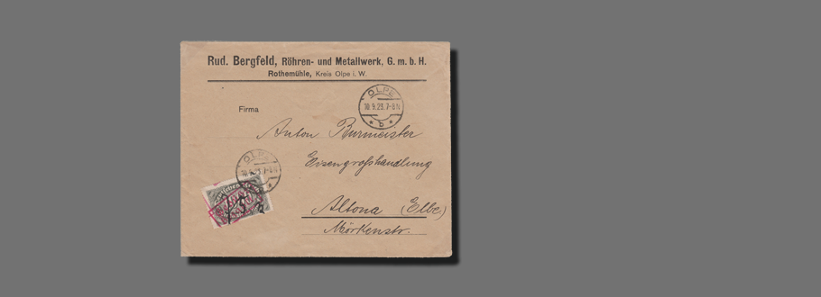The shortage of stamps during the hyper-inflation period led to large amounts of low-value stamps being used to pay the postage. For this official letter, 625 stamps of the 400 Mark value were used to pay the postage of 250,000 Marks!