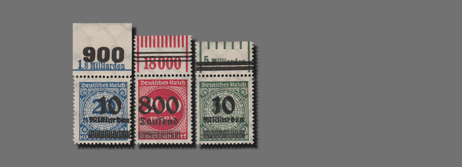 During the Hyper-inflation in 1923, the Government Printing works in Berlin were unable to cope fully with the huge demand. The Reich Ministry of Posts authorised regional post offices to organise the over-printing of selected issues. Many of these over-printings can be identified from the overprint in the top margin.