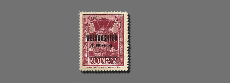 By the end of 1944 German and Italian troops were cut off from the mainland and it was becoming increasingly difficult to send mail home by airmail. As a ‘Christmas present’ to the troops on the islands of Rhodes, Kos, and Leros, it was decided, for morale purposes, to overprint redundant Italian 5ct Rhodes stamps “Weihnachten 1944” in black and give each soldier two stamps for airmail use, in addition to their usual allocation of official airmail stamps.