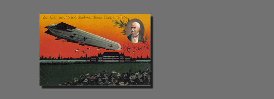 A postcard issued in 1913, which shows a zeppelin landing in front of a group of people. It was issued as the caption says 'As a souvenir of the memorable Zeppelin days' to commemorate the Zeppelin landings in various cities throughout Germany.